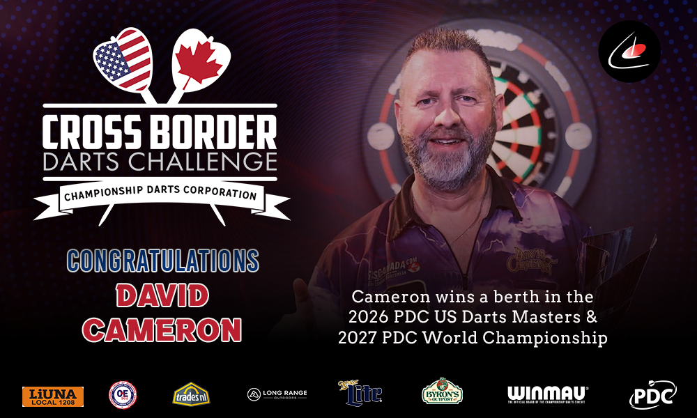 /in Main Tour, Uncategorized /by DoubleOut170David Cameron capped a brilliant weekend for Team Canada on Saturday night, defeating Adam Sevada 7-3 to win the Fourth Annual CDC Cross Border Darts Challenge in Deer Lake, Newfoundland. Night Two began with seven Canadians and one American still standing, with Sevada carrying the Stars and Stripes into the quarterfinals as the lone remaining […]